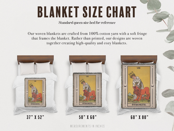 Embody inner strength with The Strength Tarot Woven Blanket. Inspired by the Rider-Waite tarot deck, this design represents courage, patience, and gentle power.